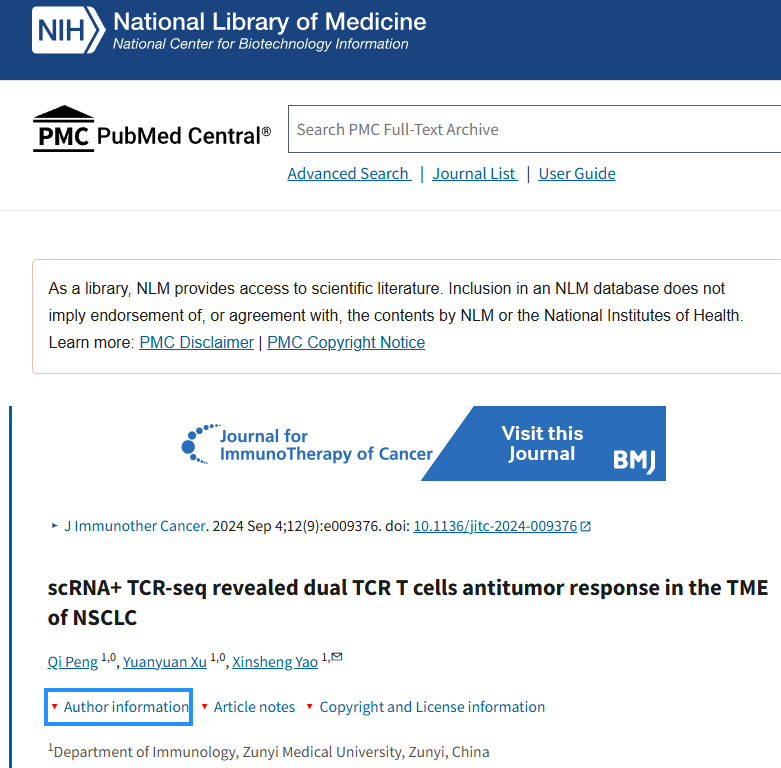 本研究以“scRNA+TCR-seq revealed dual TCR T cells antitumor response in the TME of NSCLC”为题,发表于Journal for ImmunoTherapy of Cancer:2024 Sep 4;12(9):e009376. doi: 10.1136/jitc-2024-009376(中科院一区/Top期刊,IF五年=11.6),免疫学研究生2021级彭芪和2022级徐元圆为共同第一作者,姚新生为通信作者,本研究获得国家自然科学基金和贵州省百层次人才基金资助。