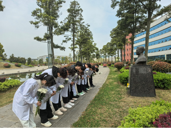 最后,师生们手捧鲜花,分别前往第四教学楼和科研楼前的先贤雕塑献花,并深深鞠躬,表达对先贤的缅怀与敬意。每一尊雕塑都承载着一段厚重的历史,每一次献花都是一次精神的传承,让师生们近距离感受着先贤们的精神力量,心中的责任感和使命感愈发强烈。
