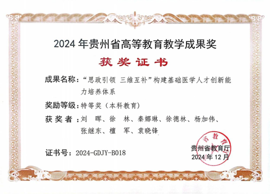 贵州省教育厅公布了2024年高等教育省级教学成果奖获奖名单,公司《“思政引领 三维互补”构建基础医学人才创新能力培养体系》项目,荣获省级教学成果最高荣誉——特等奖。