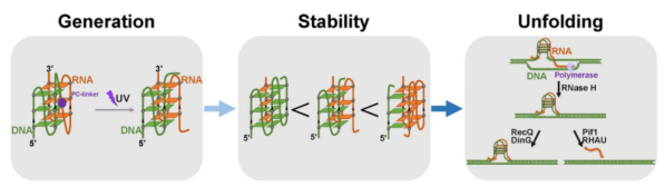 hG4是由富含鸟嘌呤(G)的DNA与RNA链组成的分子间G-四链体结构,在转录调控与端粒稳定中扮演关键角色。然而,由于传统方法无法制备均一且组成可控的hG4,其稳定性与动态调控机制长期不明。本研究设计并验证了一种基于PC-linker的紫外诱导切割新策略,成功实现了从分子内G4向分子间G4的可控转化,并可灵活调节DNA与RNA链的比例,为系统研究hG4的性质奠定了方法学基础。