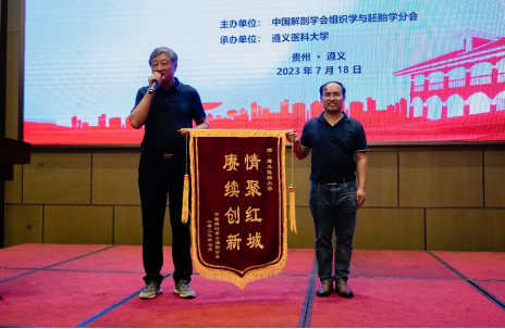 7月18日晚进行了本次会议的闭幕式,在闭幕式中进行了优秀论文报告奖、优秀墙报、首届“形态与艺术”组胚显微摄影图片展优秀作品、首届“组织学与胚胎学教学模型设计”大赛优秀作品、第四届“蒙博润助学金”的颁发。其中,檀军博士获得优秀论文报告奖、研究生代小方获得优秀墙报奖、本科生贺佳琪团队获得教学模型设计大赛二等奖、研究生陈姗姗获得蒙博润助学金。闭幕式最后,周德山主任委员代表中国解剖学会组胚分会向公司为本次会议顺利召开所做的精心组织和安排表示感谢,赠送题为“情聚红城、赓续创新”的锦旗。